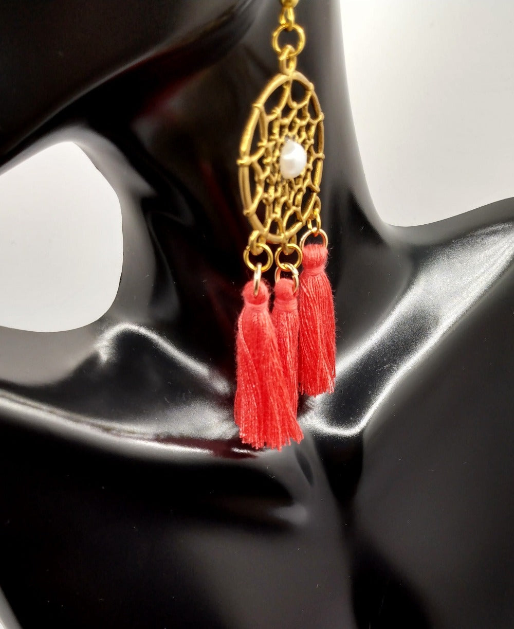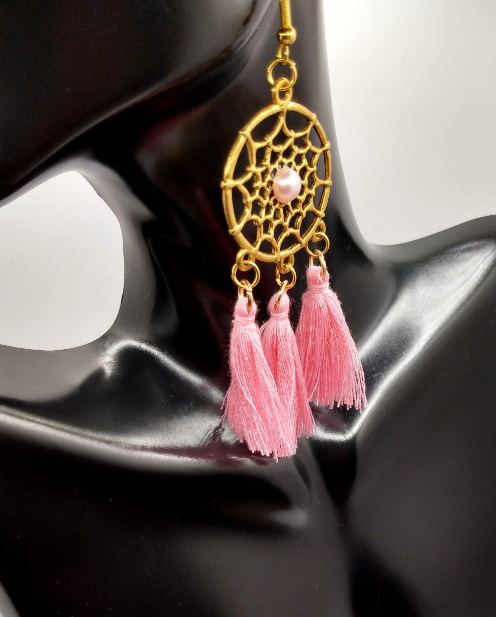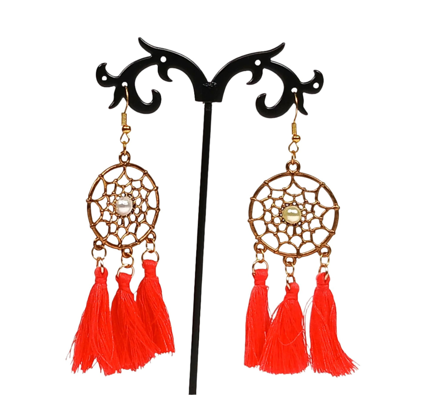 Add a free-spirited, bohemian touch to your look with these Bohemian Dreamcatcher Earrings. Featuring intricate gold dreamcatcher pendants paired with soft flowing tassels, these earrings move gracefully with every step, adding color, texture, and artistic flair to any outfit.