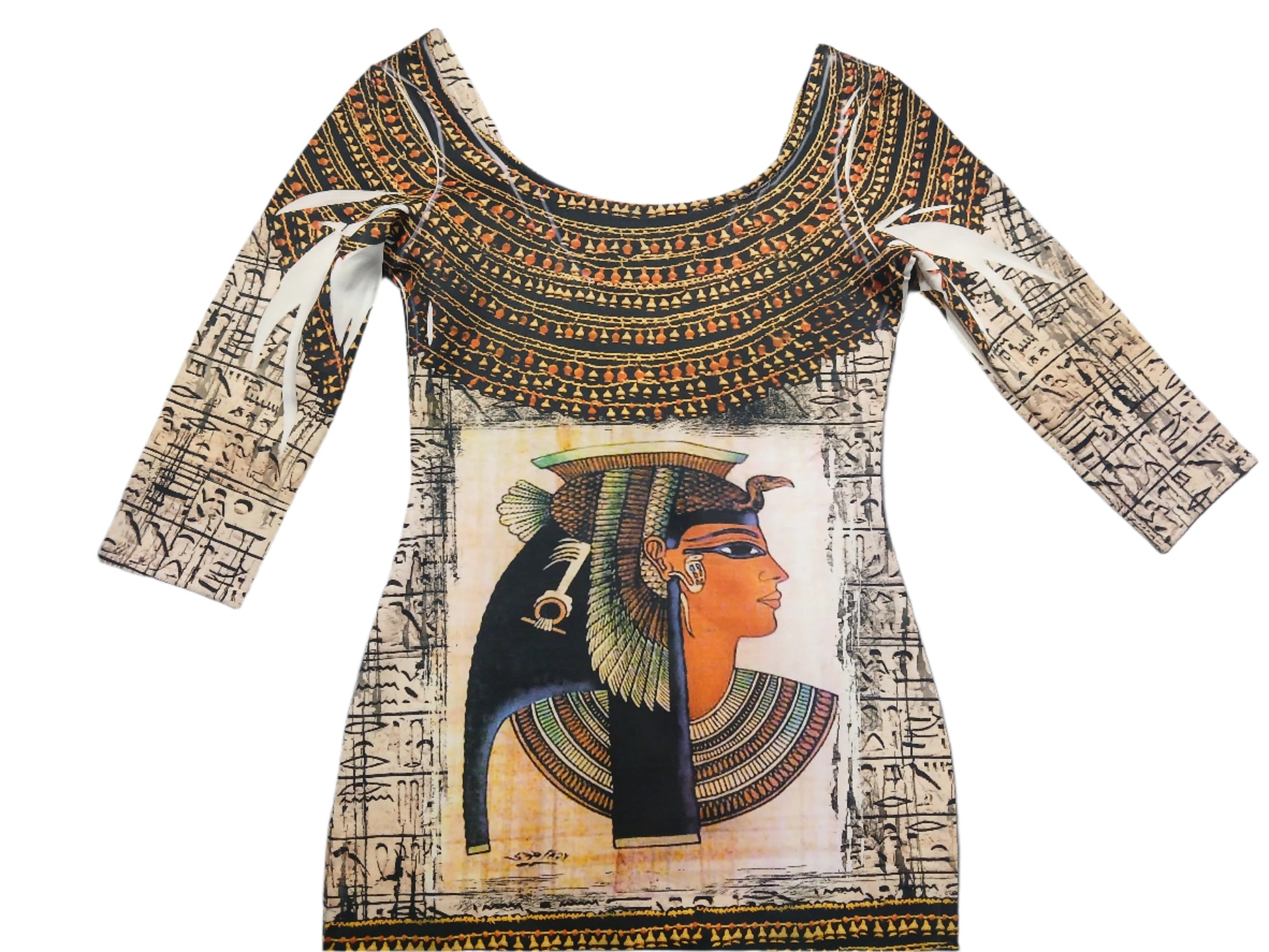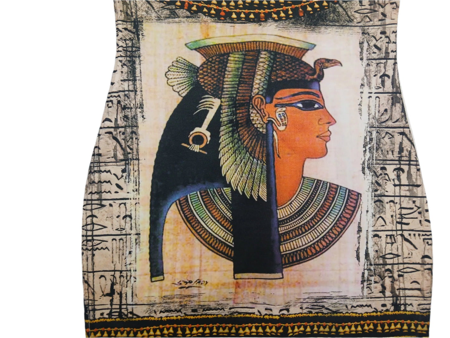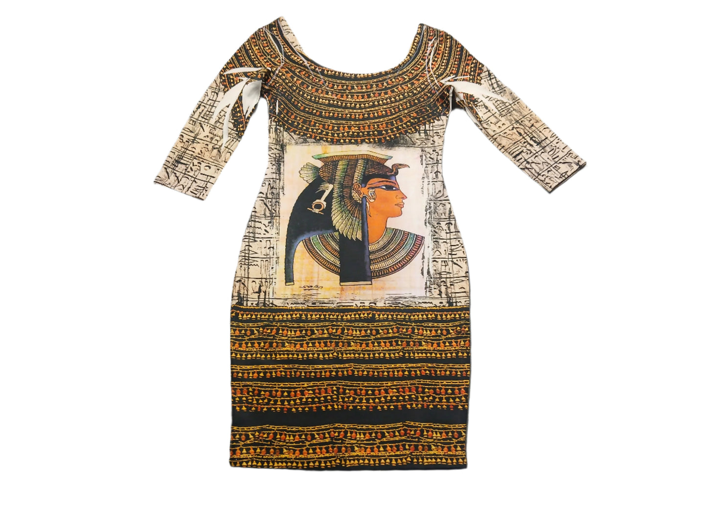 Uniquely designed Egyptian printed body dress will fit any occasion. Exact same print on the front and back of dress. Nicely fitting polyester dress with a little taste of spandex to give you that added body effect.