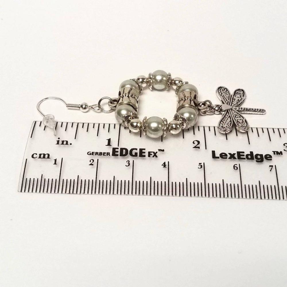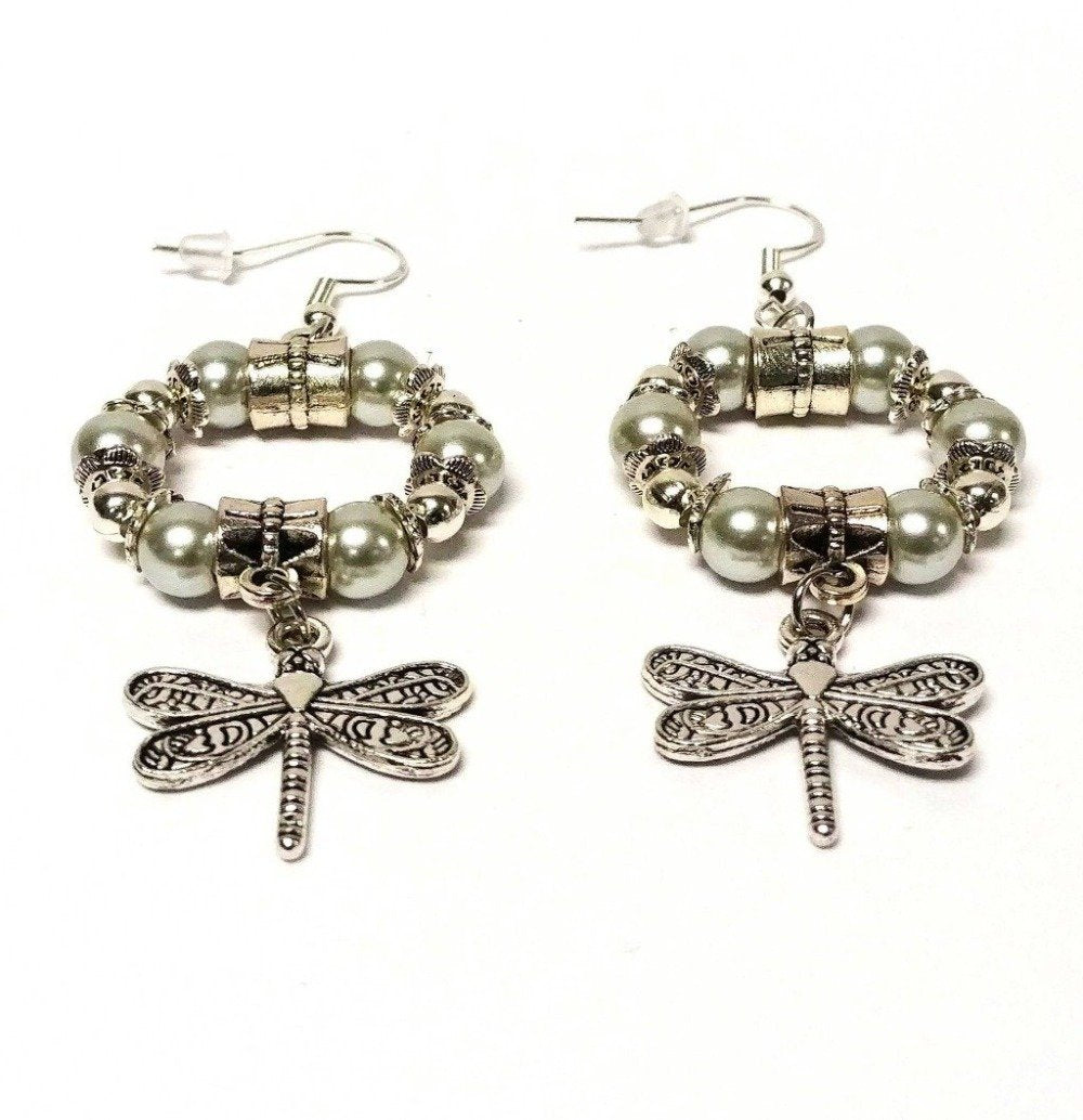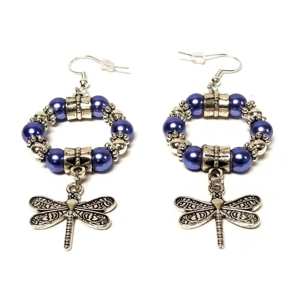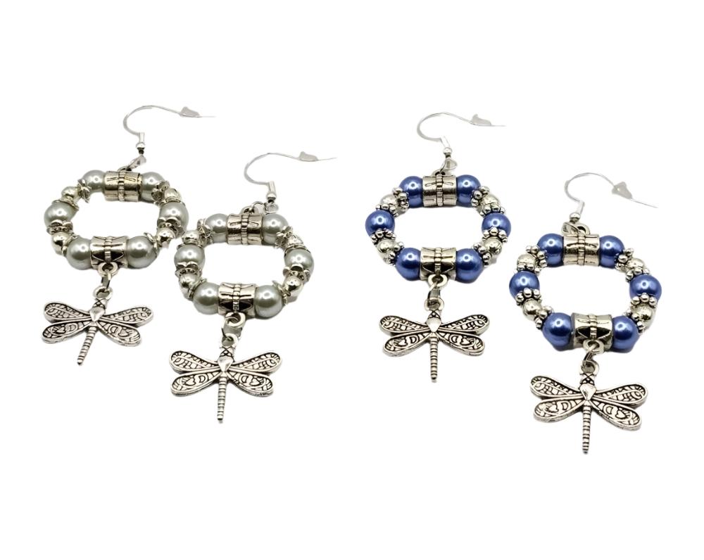 Glossy antique silver dragonfly hoop earrings are designed with glass pearl beads, two antique pendant clasps, beautiful antique silver floral spacers, and antique silver dangling dragonfly charms. Choose between two colors of silver and blue.