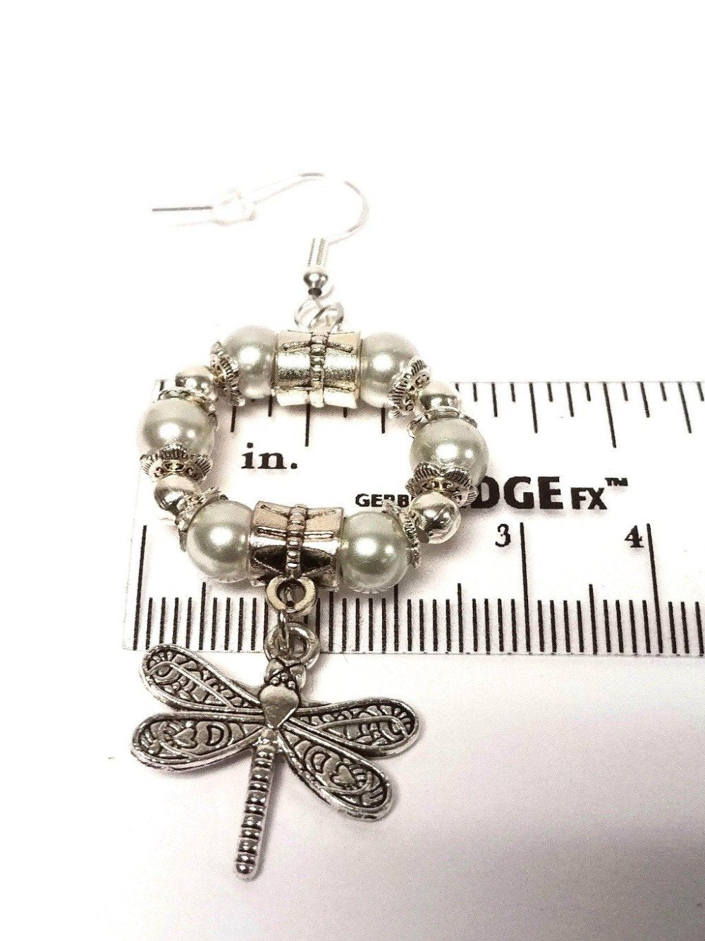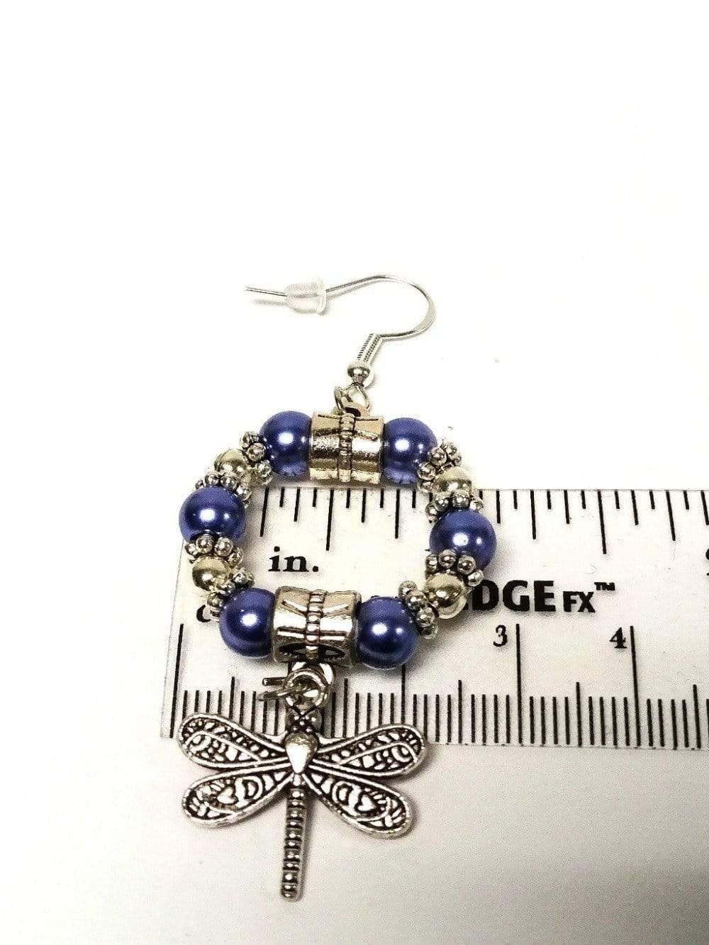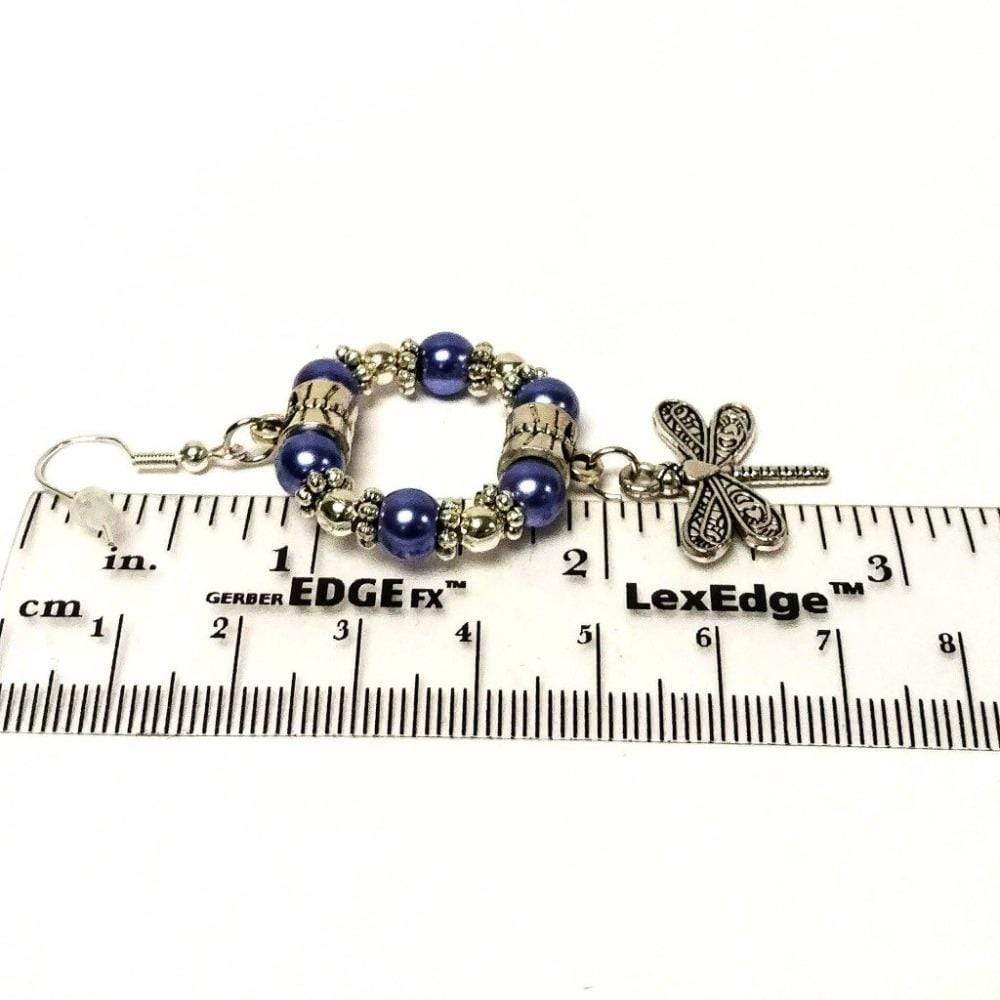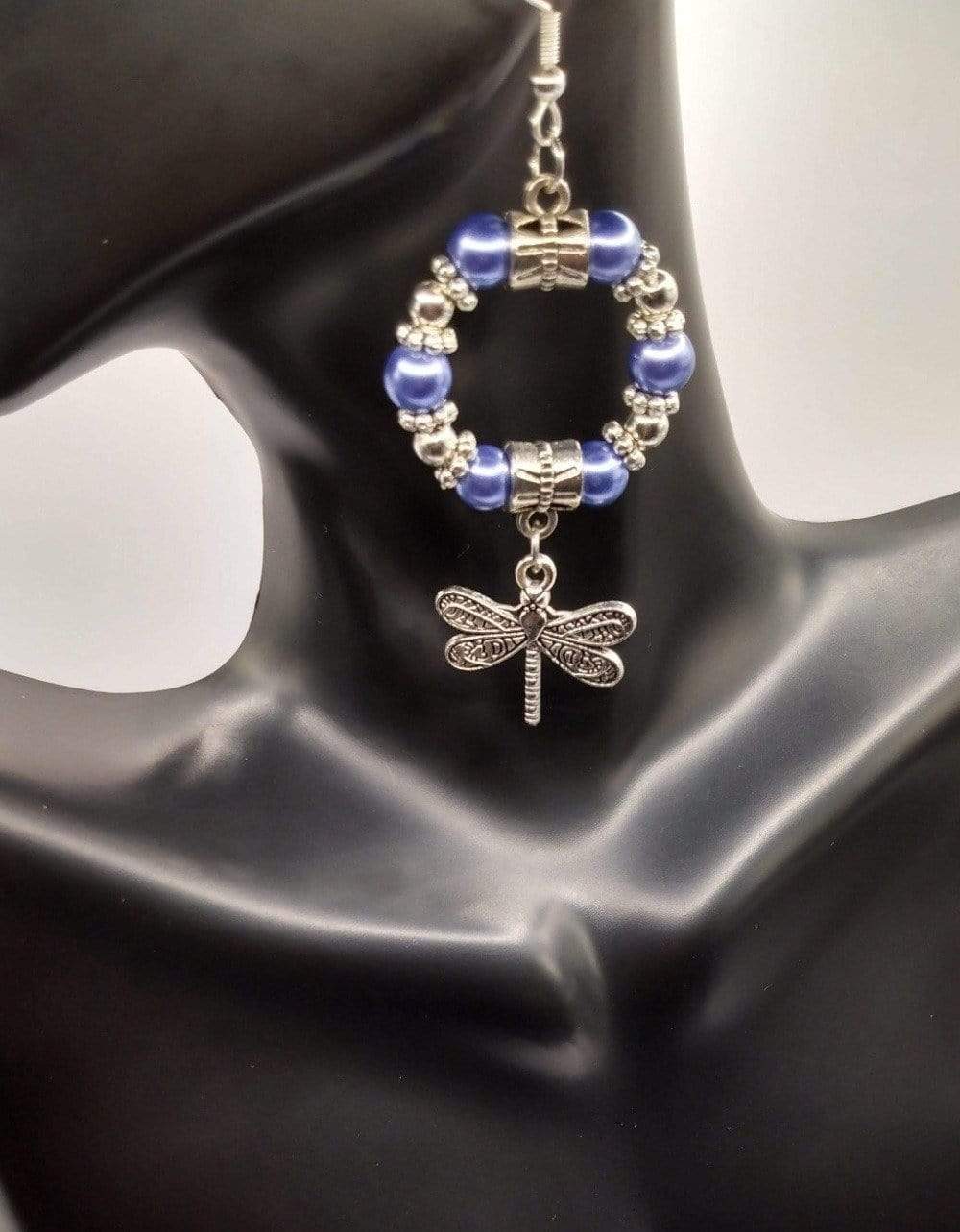 Glossy antique silver dragonfly hoop earrings are designed with glass pearl beads, two antique pendant clasps, beautiful antique silver floral spacers, and antique silver dangling dragonfly charms. Choose between two colors of silver and blue.